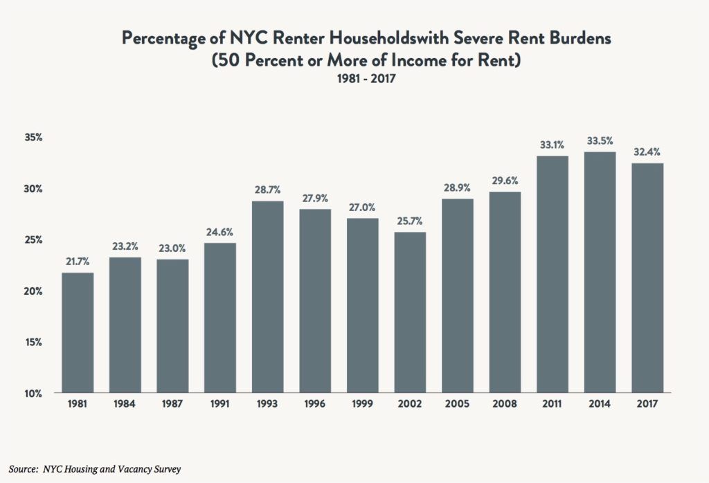 A bar graph comparing the percentage of NYC rental households with severe rent burdens (50 percent or more of income for rent) between 1981 and 2017.