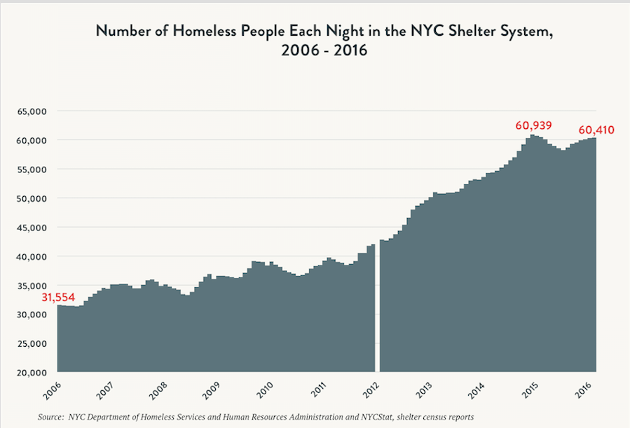 - A near-record number of individuals and families still sleep in New York City homeless shelters each night—more than 60,400 people, including 24,000 children.