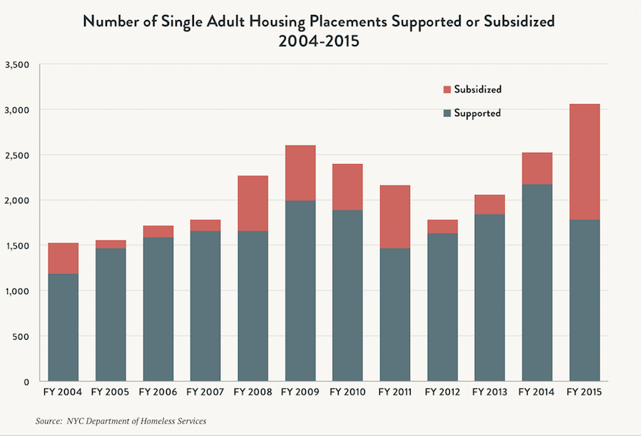 - Increase subsidized and supported housing placements for homeless single adults, particularly by adding at least 500 new scattered-site units of supportive housing this year;
