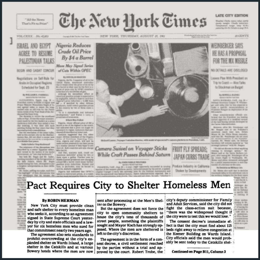 In 1979, Coalition founders filed the lawsuit Callahan v. Carey, which led to the landmark Callahan consent decree in 1981 making NYC the only city in the country with a guaranteed right to shelter.
