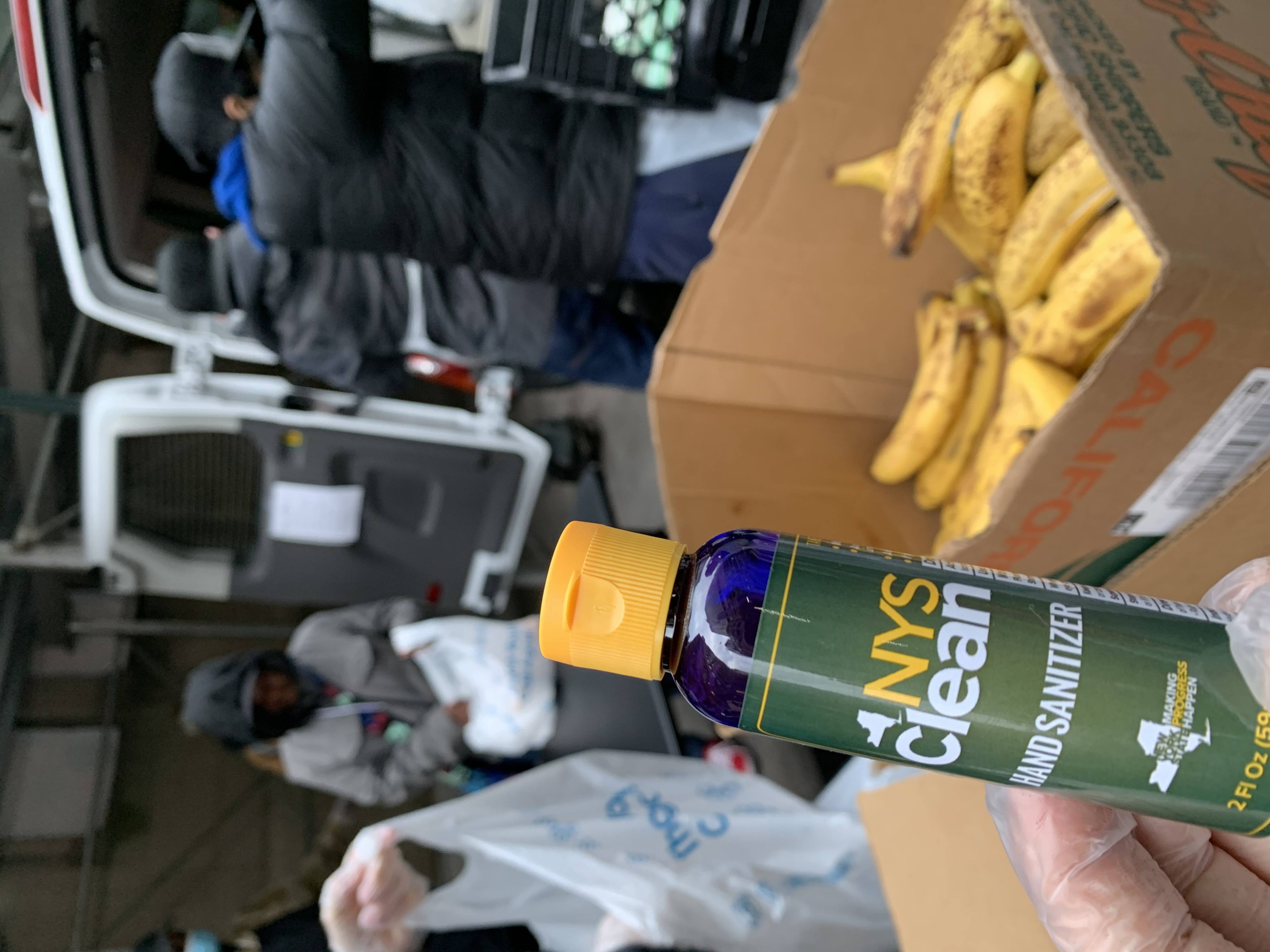 blue bottle that reads NYS Clean HAND SANITIZER box of bananas