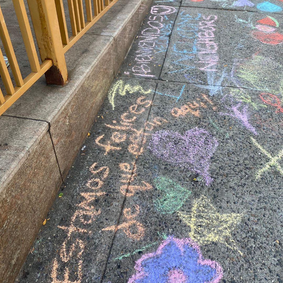 Midtown Open Hearts members came together for a community art event outside a shelter to write welcoming chalk messages.