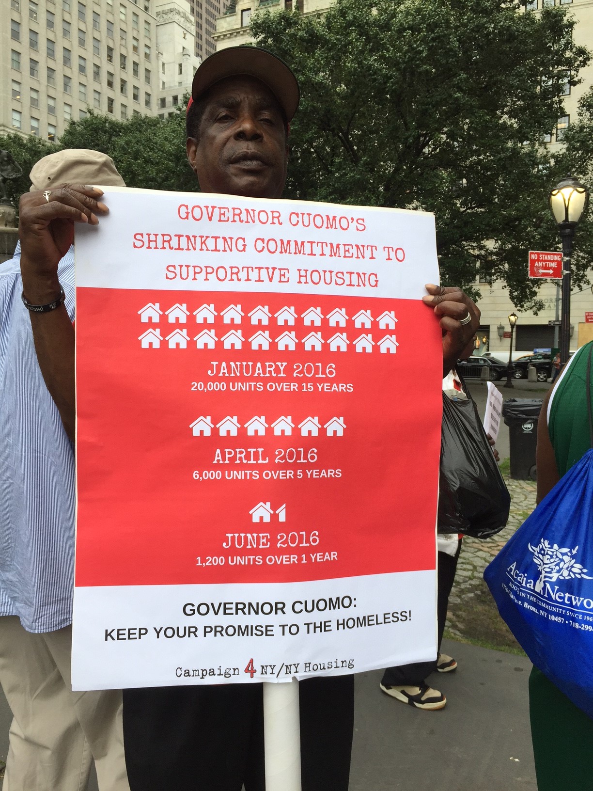 Posted on June 30, 2016 by Jacquelyn Simone The legislative session has ended, but the fight for supportive housing continues. On Tuesday, the Coalition joined homeless New Yorkers and other advocates from the Campaign 4 NY/NY Housing in a picket line outside The Plaza Hotel, where Governor Cuomo was hosting a fundraising event. While Cuomo prepares for his 2018 reelection campaign, 80,000 homeless New Yorkers statewide are languishing in shelters and on the streets, desperately waiting for him to release the $1.9 billion that was set aside for affordable and supportive housing in the State budget. But even though the funds were appropriated, the Governor and legislative leaders only released a meager $150 million in a last-minute agreement. This level of inaction raises questions as to whether Cuomo ever actually planned to keep his promise to homeless New Yorkers. In January, advocates applauded his announcement that he would create 20,000 supportive housing units statewide over 15 years. Then, in April, the State budget set aside $1.9 billion to fund the first 6,000 units along with other affordable housing initiatives – but the money was subject to a Memorandum of Understanding (MOU). Gov. Cuomo, Assembly Speaker Heastie and Senate Majority Leader Flanagan had months to finalize the details of that agreement and release the funds, but in the end they only released $150 million in new funding for 1,200 supportive units. The Campaign 4 NY/NY Housing is committed to pushing the State leaders to follow through on their promise and release the full $1.9 billion for supportive and affordable housing. We plan to keep up the pressure through rallies and actions until that promise is fulfilled.