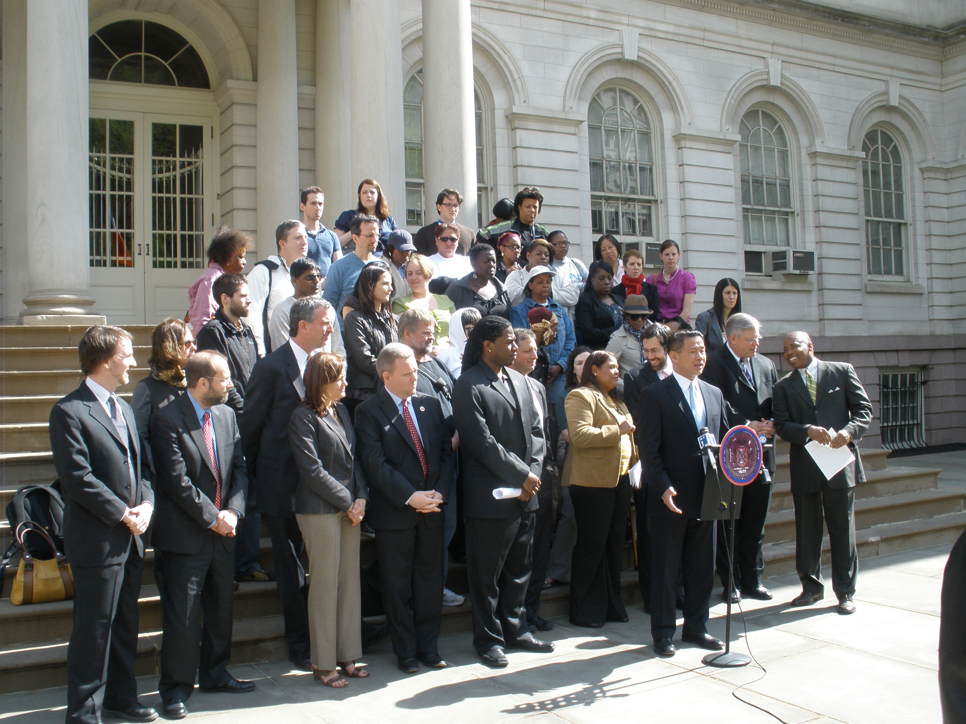 Posted on April 16, 2010 by GISELLE ROUTHIER Yesterday, elected officials, advocates, and homeless individuals gathered on the steps of City Hall to express outrage at the Mayor’s plan to start charging homeless families rent for shelter. The turnout was great. Elected officials included Public Advocate Bill de Blasio, City Comptroller John Liu, City Councilwoman and chair of the General Welfare Committee Annabel Palma, State Senator Daniel Squadron, State Senator Eric Adams, State Senator Tom Duane, and City Council Members Melissa Mark-Viverito, Brad Lander, and Jumaane Williams. WNYC, New York 1, and the Daily News all reported on the event. We, along with other advocates and elected officials, with the leadership of Assemblyman Keith Wright and Senator Daniel Squadron have been pushing the State to change the law to prohibit the City from charging homeless families rent for shelter. Take Action here!