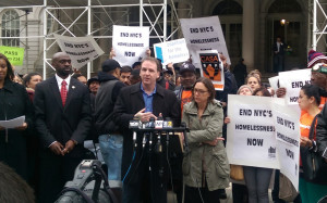 Posted on April 7, 2015 by Jacquelyn Simone The Coalition and other members of the “Homes for Every New Yorker” partnership released a new report today that presents nine strategies that Mayor de Blasio and Governor Cuomo must implement to end mass homelessness by 2020. The Coalition stood alongside community groups and labor unions on the steps of City Hall to unveil the report, Ending Homelessness: How Mayor de Blasio and Governor Cuomo Can Do It. Public Advocate Letitia James was among the elected officials who attended the press conference. She echoed the report’s call for the City to allocate more NYCHA units to homeless New Yorkers, saying, “The best way to deal with homelessness to provide someone with a home. We have control over thousands and thousands of public housing units that should be going to the most vulnerable and with the most immediate housing needs.” The report urges Mayor de Blasio and Governor Cuomo to take the following research-supported steps to end mass homelessness: 1. Set Aside 10% of All New City-Assisted Housing for Homeless New Yorkers 2. Target More NYCHA Public Housing Apartments to People in the Shelter System 3. Renew a City-State Agreement to Create Permanent Supportive Housing 4. Enhance City-State Rent Subsidies to Prevent Homelessness and Rehouse the Homeless 5. Invest in Cost-Saving Programs to Prevent Homelessness 6. Convert So-Called “Cluster-Site” Shelter Back to Permanent Housing 7. Expand Rental Assistance to All Low-Income New Yorkers Living with HIV 8. Raise the Minimum Wage to $15 Per Hour in New York City 9. Build Housing with Developers Who Use Local Hire Goals and Union Labor The report has been covered by the New York Daily News, NY1, The Associated Press, Capital New York, amNewYork, Gothamist, El Diario and others. Read the full report, which includes the background and rationale for each strategy, here.