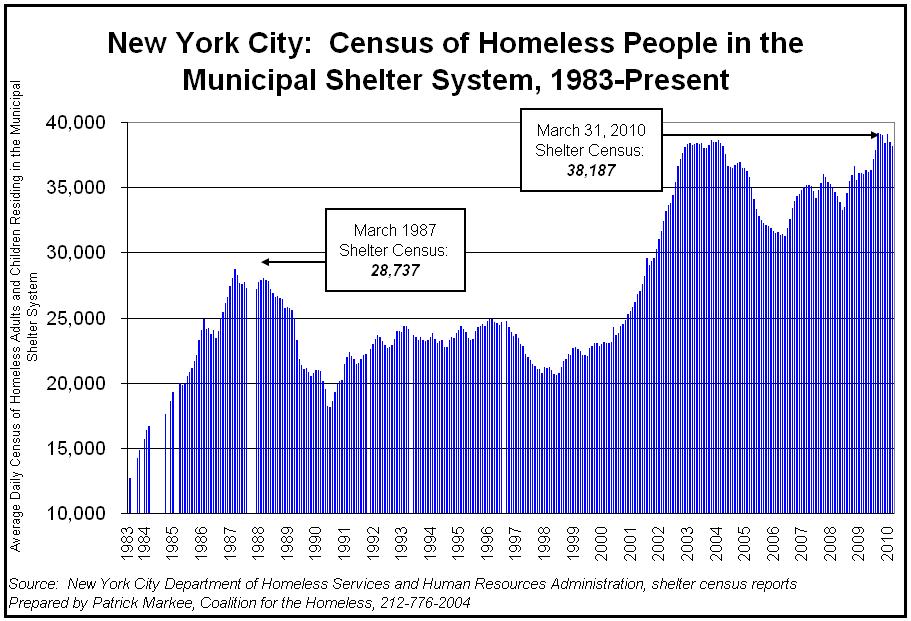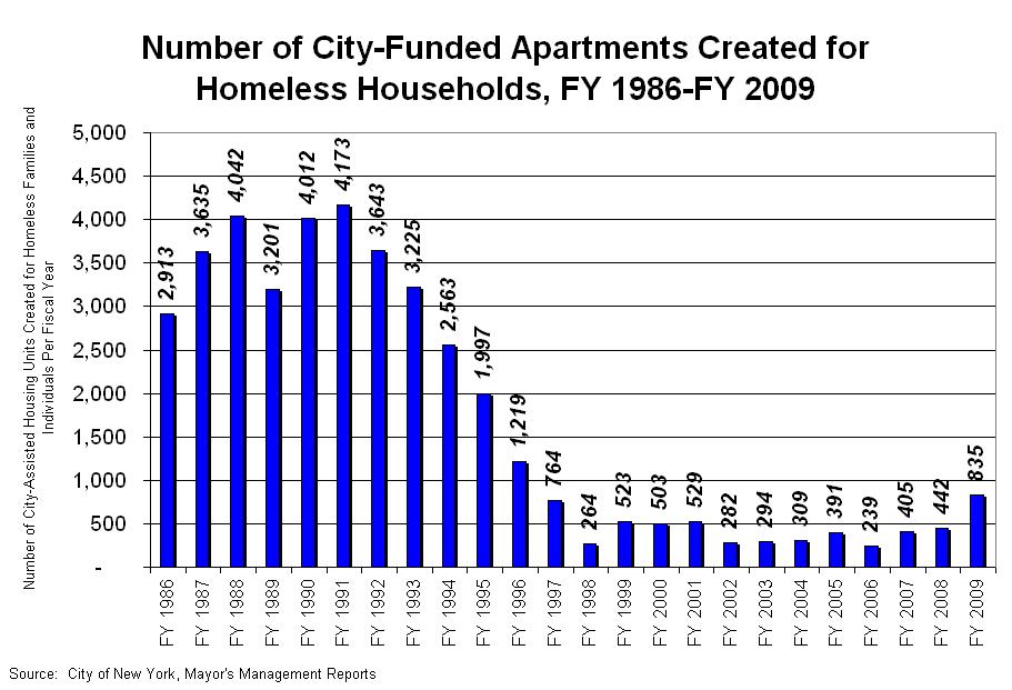 Posted on May 12, 2010 by PATRICK MARKEE Today we inaugurate an occasional feature called “Fact vs. Spin,” an attempt to counter some of the false, inaccurate spin about homelessness and housing policy that is, sadly, all-too-often perpetrated by public officials and pundits and then transmitted by the news media. A fine recent example can be found in a very brief piece recently published in Crain’s New York Business (link here, subscription required): The Bloomberg administration this week celebrated the 100,000th unit of affordable housing it has preserved or created, but some critics are not impressed. Only 4% of the units have gone to the homeless, compared with 10% under a Koch administration housing program, according to Patrick Markee, a senior policy analyst at the Coalition for the Homeless. But a city official who worked on housing under Mayor Koch says that the Bloomberg administration’s strategy prevents homelessness, and that comparisons are misleading because Koch had 100,000 vacant, in rem units to work with. “That was a different world,” the official says. The spin in this article is easy to spot because it involves assertions utterly unsupported by facts. For instance, the unnamed Koch administration official claims that the Bloomberg administration’s housing plan “prevents homelessness.” The reality, however, is that homelessness has reached all-time record levels under Mayor Bloomberg, and last year 45 percent more homeless New Yorkers slept in New York City shelters compared to when the Mayor took office. If the Mayor’s housing plan actually “prevents” homelessness, it has to be rated as a miserable failure. Second, the anonymous official also refers to the City’s stock of tax-foreclosed (in rem) properties in the 1980s and describes it as a “different world.” While the City did indeed have more in rem housing two decades ago, that is irrelevant to the issue of how many City-funded apartments are targeted to homeless families and individuals – whether they were once in rem units, new construction, or in rehabilitated buildings. And as the chart below illustrates, so far under Mayor Bloomberg only 3,197 housing units have been created for homeless households out of the 100,000 completed to date – that is, less than 4 percent of the total. That is compared to the more than 15,000 housing units created for homeless people under Mayor Koch’s ten-year “Housing New York” program. Finally, you know it’s spin when the spinner utterly ignores the bigger picture. And here that involves the relative scale of New York City’s homeless problem under Koch and Bloomberg. As the chart below shows, under Mayor Koch the municipal shelter population never exceeded 29,000 homeless people, while under Mayor Bloomberg the shelter population soared to more than 39,000 people in recent months. Thus, with fewer homeless New Yorkers, Mayor Koch launched a much more ambitious – and successful – effort to create affordable housing for homeless families and individuals. And in this light, Mayor Bloomberg’s lesser effort is even more troubling.
