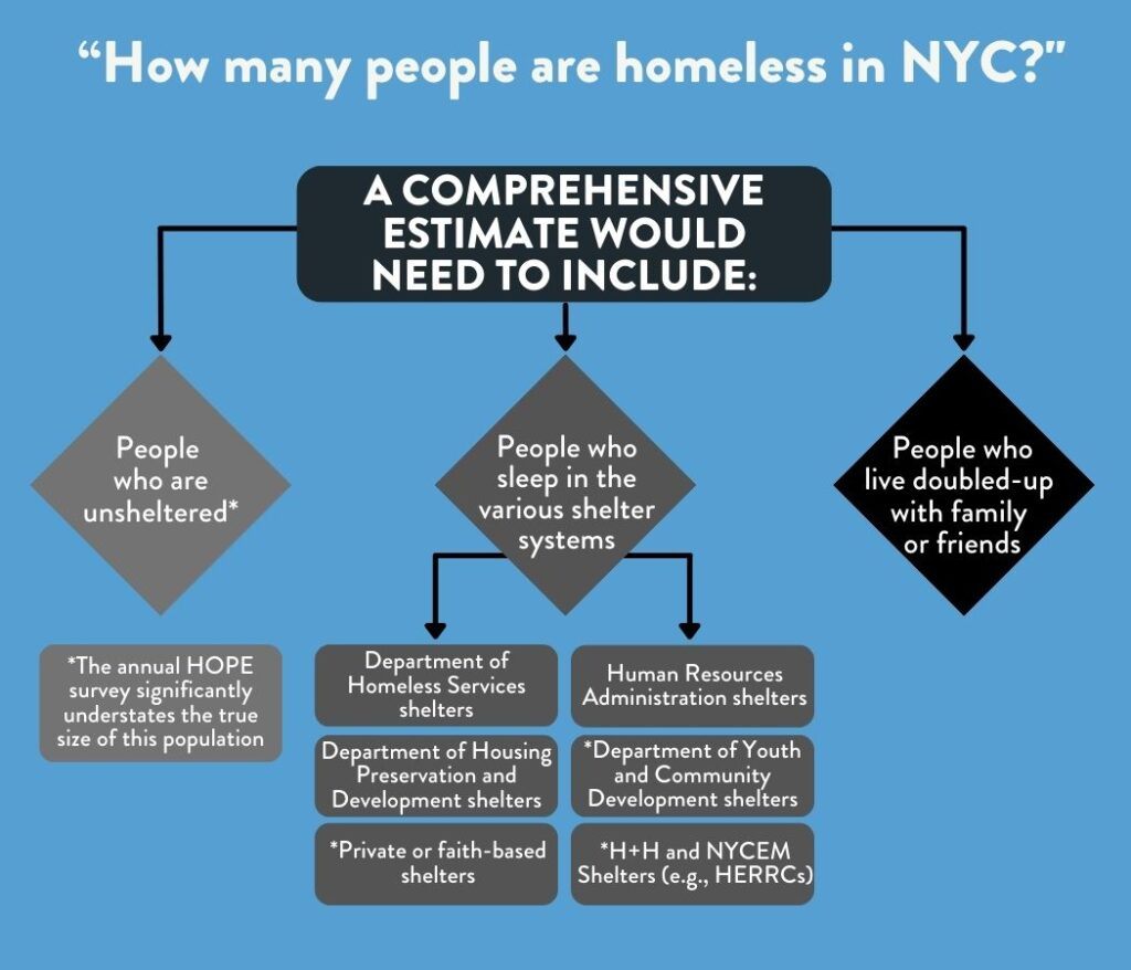 Many households who have lost their homes live doubled-up or tripled-up in the homes of others. The exact number of people living in such precarious conditions in NYC is difficult to determine exactly, but is estimated to exceed 200,000 given that: