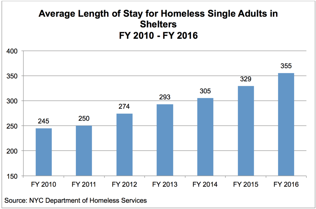 The overall lack of housing options available to homeless single adults in shelters has also resulted in an average length of stay that is now longer than ever: It reached a full 355 days in fiscal year 2016, an increase of 45 percent from fiscal year 2010 (Figure 12).