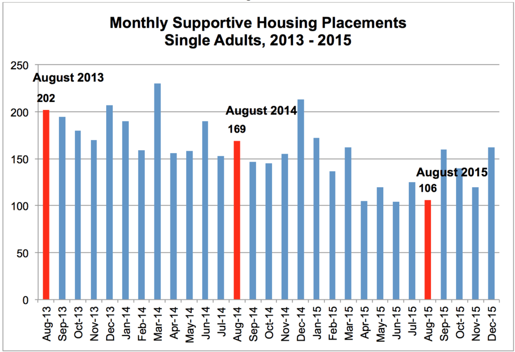The number of supportive housing placements in August in each of the past three years is another useful benchmark to illustrate the recent decline. In August 2013, 202 single adults received supportive housing placements; in August 2014 there were 169 adults placed; and in August 2015 there were 106 (Figure 11). Showing a decline of nearly 50 percent, these statistics highlight the urgent need to codify and finance a long-term plan to build and operate tens of thousands of new units of supportive housing.