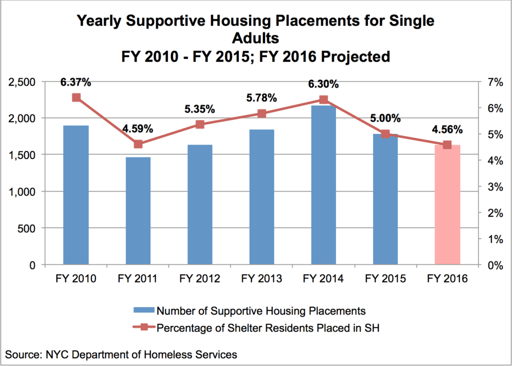 Despite the increase in the number of people leaving shelters with the help of subsidies, supportive housing placements have declined since fiscal year 2014, reaching a monthly low of just 104 placements in June 2015. The total number of placements in fiscal year 2015 fell below the previous year, and the monthly data for the first half of fiscal year 2016 suggest an even more dramatic decline ahead. An analysis of data from the first six months of FY 2016 indicates that supportive housing placements, as a proportion of homeless single adults in shelters, could drop to their lowest rates since at least fiscal year 2010 (Figure 10).