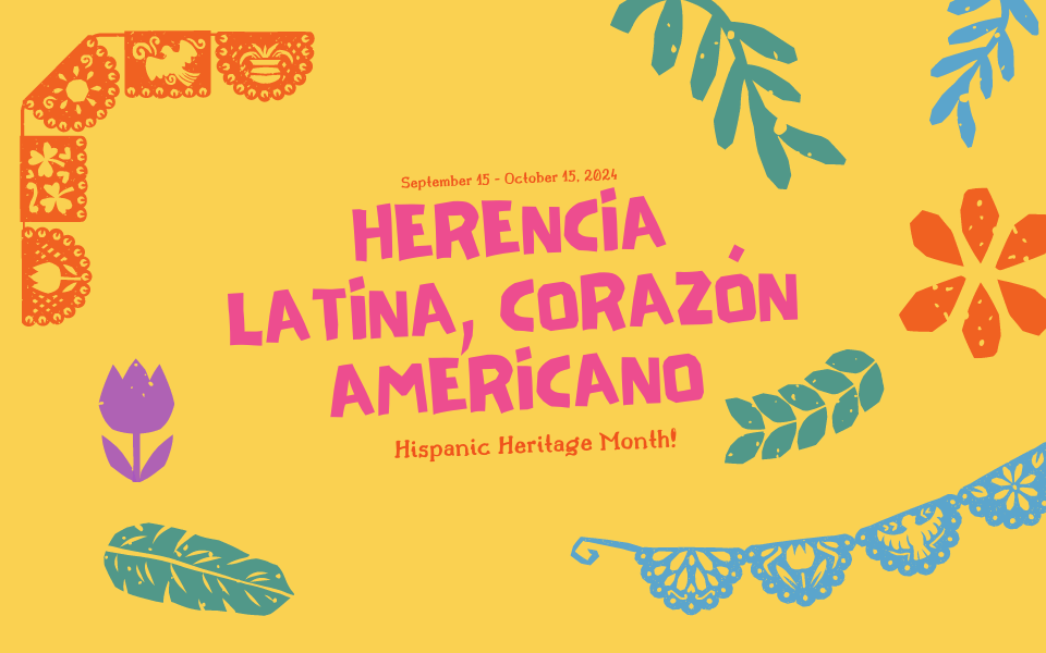 A yellow text graphic with patterned bunting framing text that reads “september 15 – october 15, 202′”, “herencia ;atina, corazon americano” and “hispanic heritage month”.