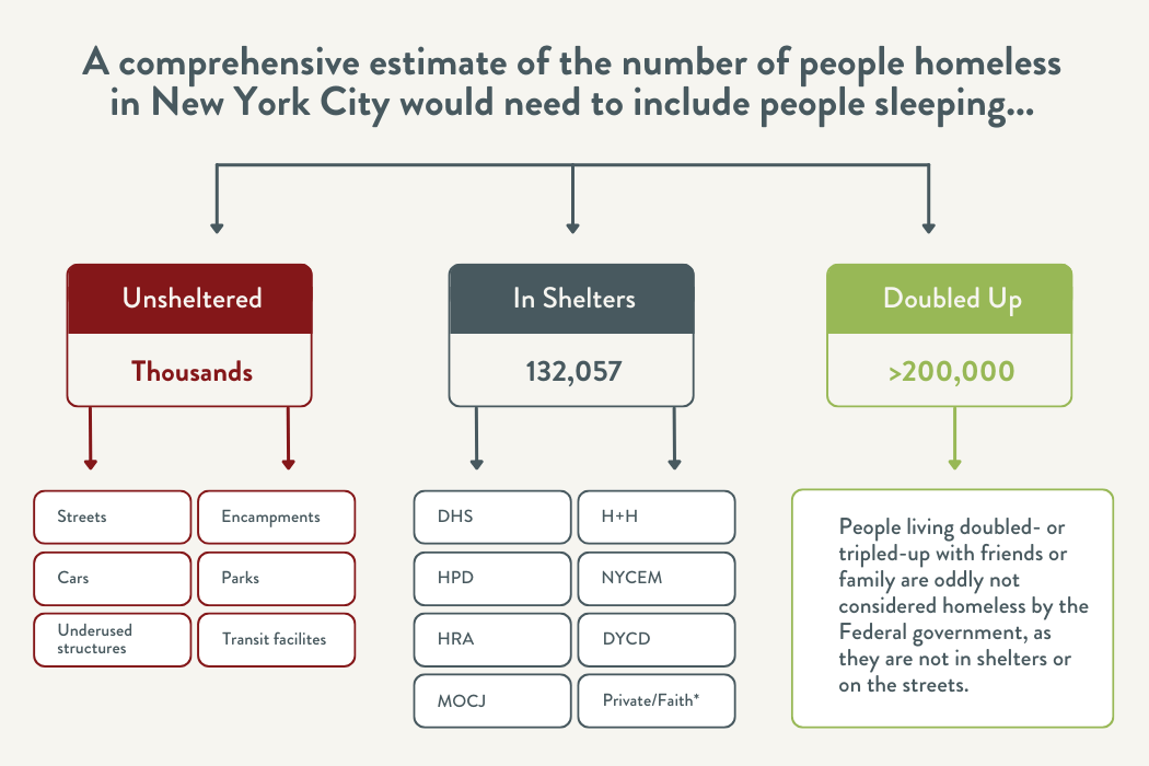 A flowchart labeled “A comprehensive estimate of the number of people homeless in New York City would need to include people sleeping…” with three arrows pointing to three separate boxes, each with one of the following: “Unsheltered (Thousands)”, “In Shelters (131,940)” and “Doubled Up (>200,000)”. Under the Unsheltered box are two arrows pointing to six boxes, each with one of the following words/phrases: Streets, Encampments, Cars, Parks, Underused structures, and Transit facilities. Under the In Shelters box are two arrows pointing to eight boxes, each with one of the following acronyms/phrases: DHS, H+H, HPD, NYCEM, HRA, DYCD, MOCJ, and Private/Faith. Under the Doubled Up box is a single arrow pointing to a box with the following statement: “People living doubled- or tripled up with friends or families are oddly not considered homeless by the Federal government, as they are not in shelters or on the streets”.