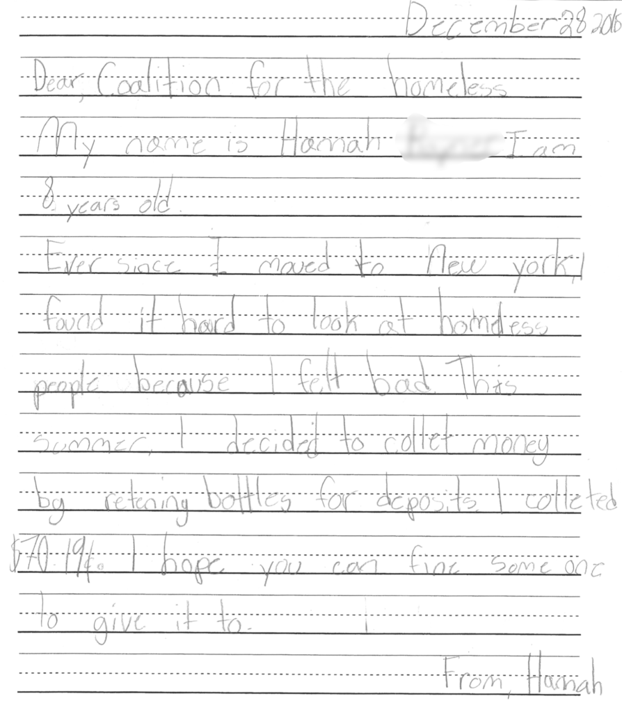 Dear Coalition for the Homeless: My name is Hannah. I am 8 years old. Ever since I moved to New York, I found it hard to look at homeless people because I felt bad. This summer, I decided to collect money by returning bottles for deposits. I collected $70.19. I hope you can find someone to give it to. From: Hannah