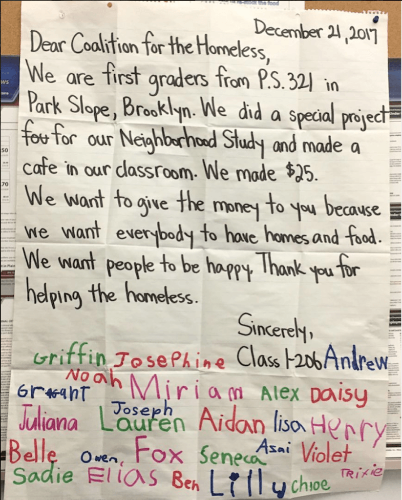 This was a note Maribella gave out with money she collected for homeless New Yorkers.