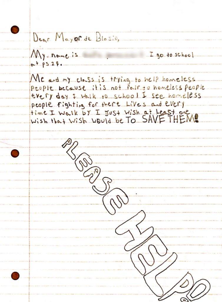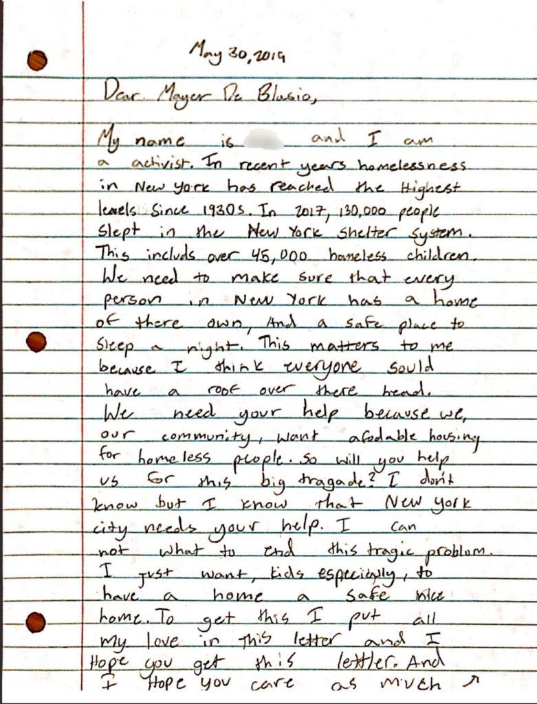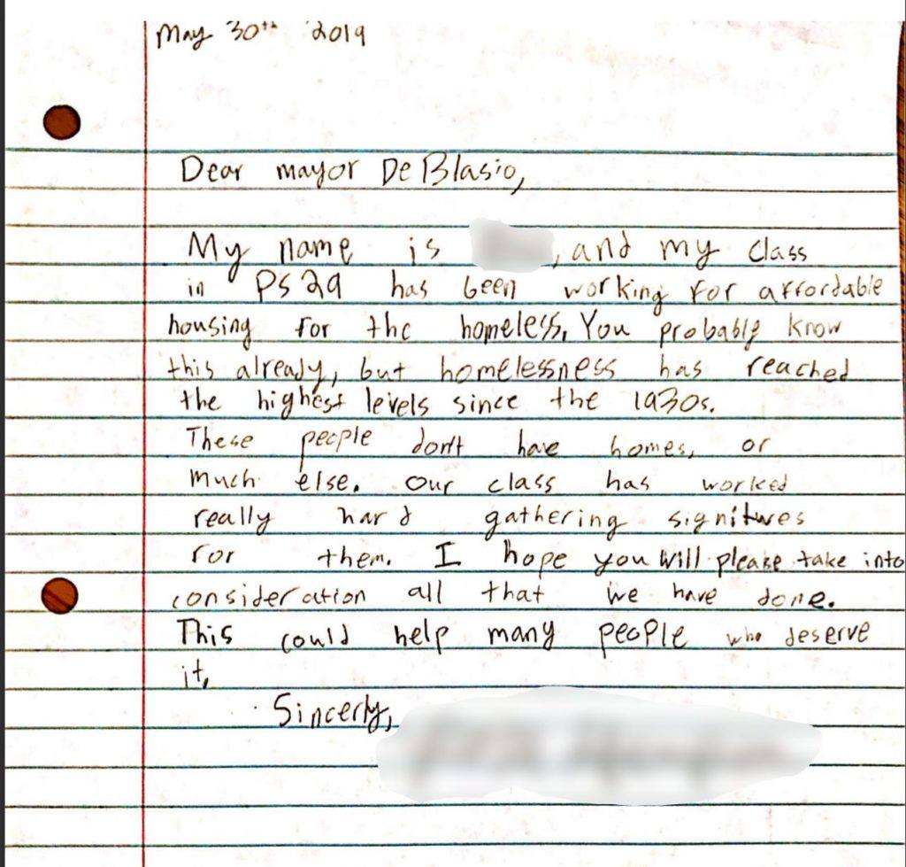 Letter from a fourth grader at PS 29 to Mayor de Blasio as part of the