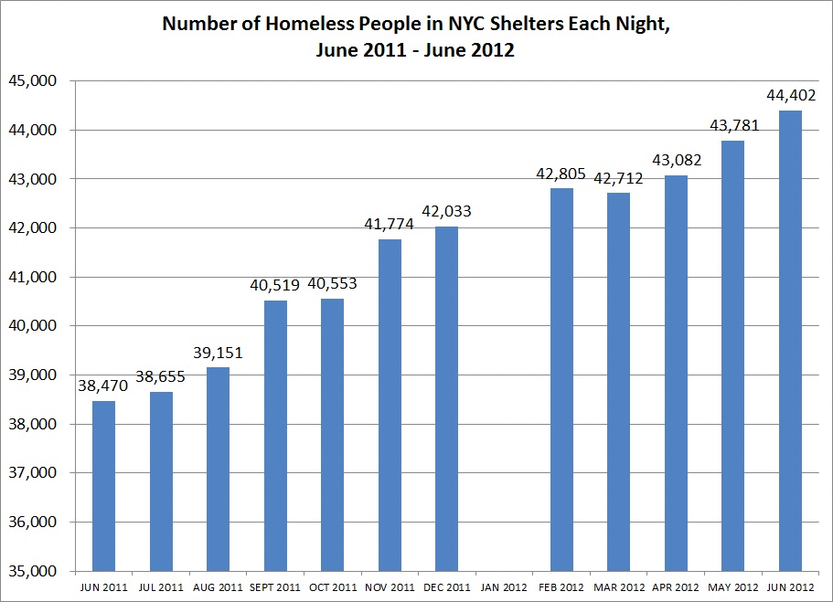 City data show that, in June, the average number of homeless New Yorkers bedding down in the municipal shelter system hit a new record high of 44,402 people, with a record 10,658 families and 17,986 children. Charts and tables breaking down these alarming stats can be found here.