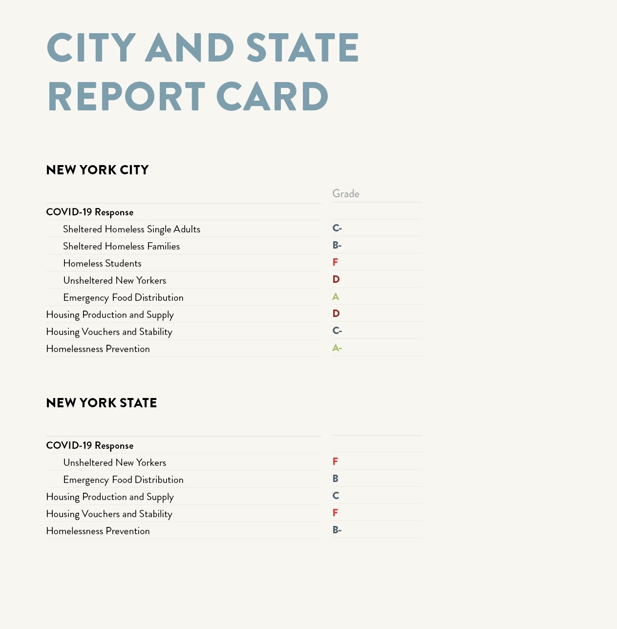 April 29, 2021 Coalition for the Homeless By Coalition for the Homeless 2021 Marks 40th Anniversary of the Right to Shelter Advocates Urge Immediate and Large-Scale Action to House Homeless New Yorkers as Homelessness Among Single Adults Soars to All-Time Record High Report Faults City and State for Being Unprepared to Protect Homeless New Yorkers from COVID-19, and Slow to Respond NEW YORK, NY — The Coalition for the Homeless’ State of the Homeless 2021 report, Housing is Health Care, A Lesson for the Ages, provides a comprehensive look at homelessness in New York City during a year of crisis that has forever changed the landscape of our city. The report comes 40 years after the right to shelter was first established in New York City with the signing of the Callahan Consent Decree in 1981. In February 2021, the number of single adults sleeping each night in New York City Department of Homeless Services (DHS) shelters reached a new all-time high of 20,822. The report shows that homeless single adults frequently cycle between shelters, the streets, hospitals, nursing homes, unstable housing, and jails and prisons, exposing the feeble – often nonexistent – safety net for low-income people, particularly those living with disabilities. Meanwhile, the number of babies born to parents sleeping in shelters reached 1,399 – the highest on record since at least 2015. The need for the dignity and safety of a home has never been more strikingly obvious than it has over the past year. State of the Homeless 2021 analyzes how the COVID-19 pandemic laid bare profound health and economic disparities in New York City and has taken a devastating toll on people of color and those who lack stable housing. The report highlights the impact of the pandemic on homeless individuals and families who lack safe and private places in which to practice preventive measures like social distancing and frequent handwashing while a deadly, airborne virus continues to spread across the city. State of the Homeless includes a “report card” that grades the State and City on their respective efforts to prevent homelessness, provide housing vouchers, produce affordable and supportive housing, and meet the needs of homeless individuals and families sleeping in shelters or staying on the streets and subways. This year’s report also includes grades for the City and State on their responses to the COVID-19 pandemic. “This pandemic has established with unequivocal clarity that housing is health care. Thousands of individuals sleeping in congregate shelters were left exposed to the virus by the City’s slow response to the crisis, placing lives at risk. Unsheltered New Yorkers, likewise, faced an abrupt end to many services and resources they had come to rely on for survival, exacerbated by the kneejerk implementation of aggressive and deeply counterproductive policing tactics advanced by Governor Cuomo and Mayor de Blasio. The past year was unprecedented in so many ways, but the coming year could see a new and shocking increase in homelessness if our elected leaders do not take urgent and large-scale action to keep low-income New Yorkers from being evicted into homelessness, and to help the tens of thousands of currently homeless individuals and families move into the safety and dignity of permanent homes,” said Giselle Routhier, Policy Director at Coalition for the Homeless. Recommendations State of the Homeless 2021 outlines key steps the City and State can take immediately that match the scale and urgency of the crisis, including: HousingGovernor Cuomo must: Implement the Home Stability Support (HSS) program to create a State-funded, long-term rent subsidy for households receiving public assistance who are homeless or at risk of losing their housing due to eviction, domestic violence, or hazardous housing conditions. Implement the Housing Access Voucher Program (HAVP) to create a State-funded, long-term rent subsidy for homeless and very low-income households. Accelerate the pace of production of the 20,000 units of supportive housing pledged by the Governor in 2016 by completing them by 2026 instead of 2031, and fully fund the construction and operation of the remaining 14,000 units. Ensure effective reentry planning for individuals being released from State prisons in order to identify viable housing options prior to each individual’s scheduled release date. Mayor de Blasio must: Implement the Fair Chance for Housing Act (Intro. 2047) to prohibit housing discrimination on the basis of an arrest or conviction record in New York City. Raise the rent levels for CityFHEPS rent vouchers to Section 8 payment standards and eliminate the benefits cliff (Intro. 146). Allocate at least three-quarters of tenant-based Section 8 vouchers made available each year to homeless households so they can exit shelters. Accelerate the timeline for the creation of 15,000 City-funded supportive housing units by scheduling their completion by 2025 rather than 2030. Mayor de Blasio and Governor Cuomo should together: Call on the Federal government to fund Section 8 vouchers as an entitlement for all households who meet the eligibility standards. Fund the production of more housing specifically for homeless single adults, separate and apart from their respective existing supportive housing commitments. Shelters and Unsheltered HomelessnessMayor de Blasio must: Provide single-occupancy hotel rooms for all homeless individuals living in congregate shelters and those living on the streets or sleeping in the subway system for the duration of the COVID-19 pandemic. Initiate the redesign of emergency shelter facilities, with the expectation that the risk of exposure in future pandemics will require the provision of private rooms including bathrooms for each individual or household, and with attention to the principles of safety, public health, accessibility, and individual autonomy. Reform the process of providing outreach to unsheltered 
