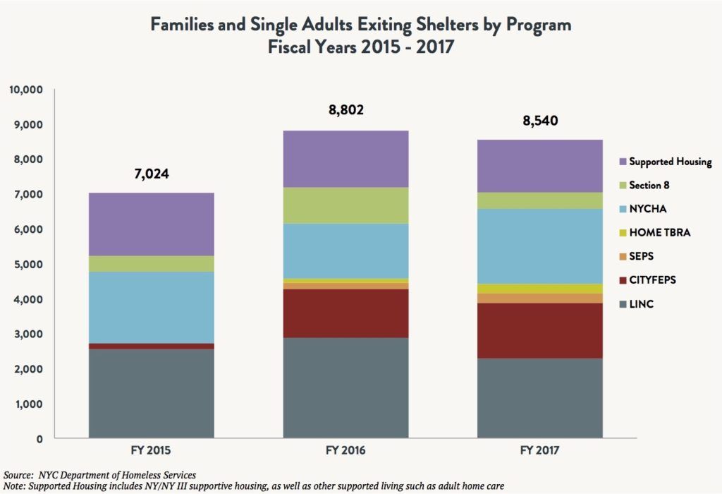 Nearly 61,000 men, women, and children lay their heads down each night in New York City shelters. While this is 2,000 fewer people than the peak in November 2016, the scope of the current homelessness crisis cannot be overstated. More people are homeless in New York City now than the entire populations of Niagara Falls, Troy, or Binghamton. The underlying cause of mass homelessness continues to be the severe lack of affordable housing and the fallout from the “Lost Decade” between 2005 and 2014, when virtually no Federally funded long-term rent supplements were provided to homeless households. During this period, the number of men, women, and children sleeping each night in shelters increased by nearly 70 percent. The Lost Decade fueled an unprecedented spike in the number of families repeatedly experiencing homelessness due to a lack of stable housing. In this nine-year span, an average of 3,500 fewer homeless families per year were placed into permanent housing using Federal resources – leaving thousands of men, women, and children to languish in shelters without any housing assistance, and with many eventually returning to shelters from less-than-stable arrangements.