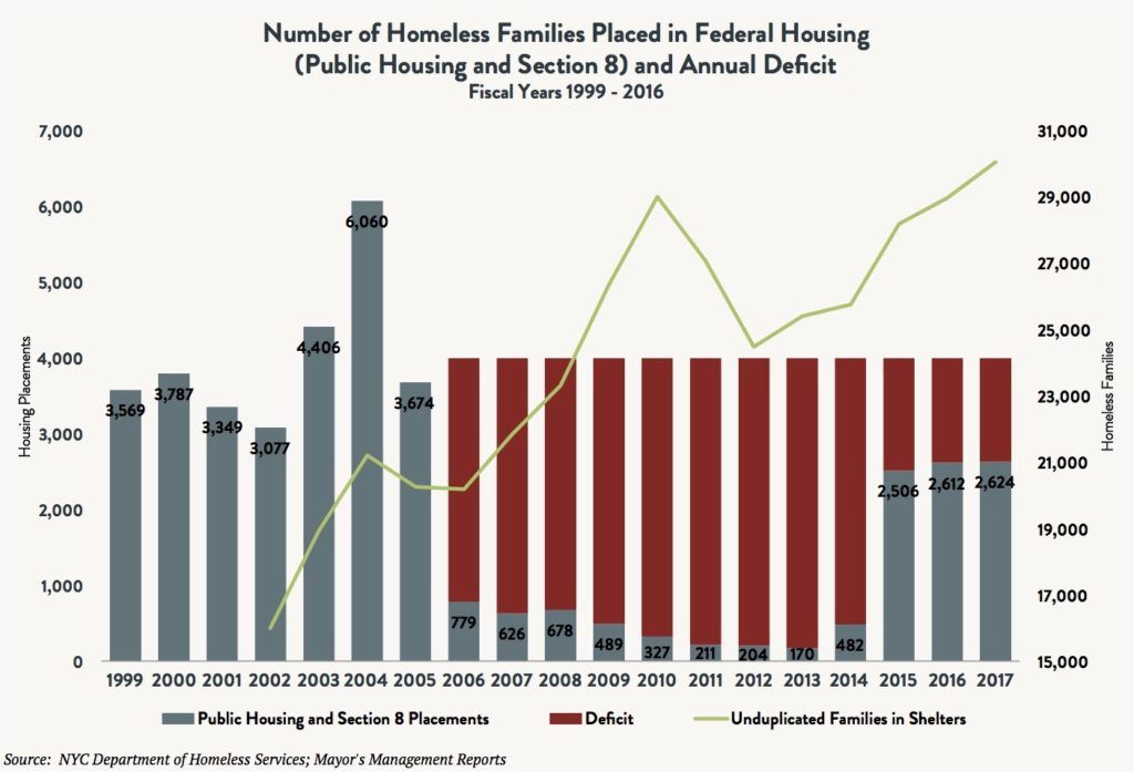 From 1999 to 2005, the City helped an average of 3,989 homeless families per year move out of shelters and into stable permanent housing using Federal housing resources. Despite the proven success of these programs, in 2005, then-Mayor Michael Bloomberg stopped giving homeless families priority access to Federal housing programs under the erroneous assumption that their availability was drawing families into the shelter system. As a result, from 2006 to 2014, the number of homeless families placed into permanent housing using Federal resources dropped to only a few hundred per year – a reduction of more than 3,500 families per year on average.