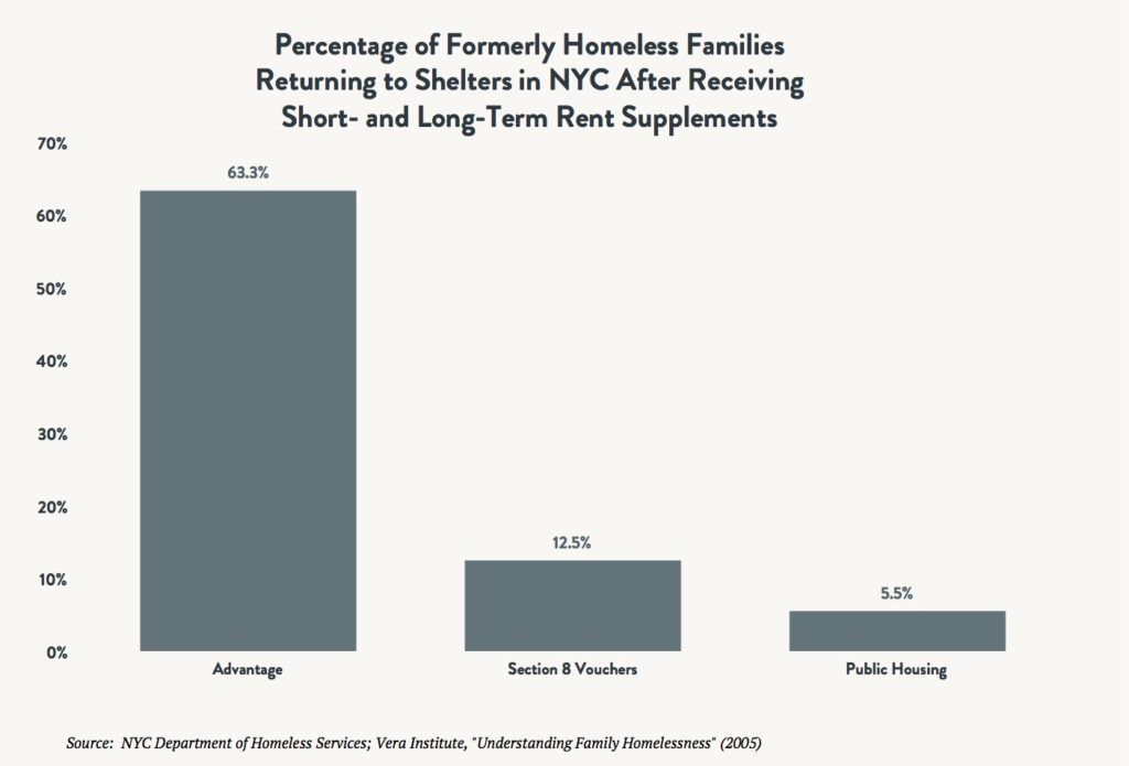 There is no question that the provision of permanent, affordable housing is the best way to address homelessness and keep families stably housed. Research has shown that families who receive permanent rent supplements do in fact achieve housing stability and only rarely fall back into homelessness. The proportion of homeless families returning to shelters after receiving long-term Section 8 vouchers is only 12.5 percent after five years, compared with the aforementioned 63.3 percent for those who received time-limited Advantage subsidies.