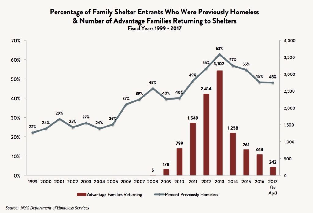 HSP was replaced by a new subsidy program called Advantage that offered a maximum of two years of rental assistance. By abruptly cutting off financial assistance for rent after the two-year period – regardless of the stability of the housed family – the program was designed to fail. Thousands of homeless families who exited shelters with the Advantage subsidy simply ended up returning to homelessness a year or two later when their subsidies expired. Of the 17,258 families that left shelters with Advantage and did not subsequently transition to a different permanent subsidy, an astonishing 63 percent returned to shelters between 2008 and 2016, with the majority returning between 2011 and 2013. Because of this deeply flawed policy, 10,926 families were forced to experience the trauma of homelessness for a second time.