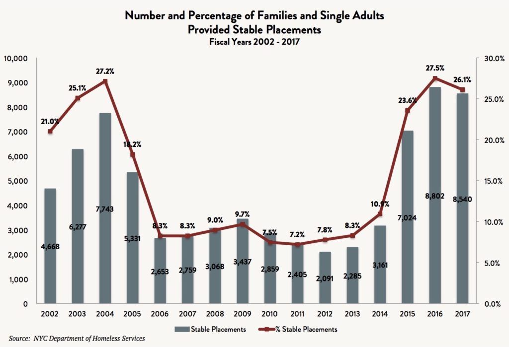 Despite a number of improvements in City and State programs for homeless New Yorkers over the past three years, families with prior histories of homelessness still return to shelters at nearly twice the rate they did in 2005. Over the course of the Lost Decade, an average of 3,500 fewer families each year exited shelters into permanent housing. The effects of this disastrous policy are still being felt as the number of homeless families continues to hover at near-record levels. Mayor de Blasio’s policies of prioritizing homeless households for Federal housing resources and making longer-term rent subsidies available are increasing the odds that homeless New Yorkers will find and remain in permanent housing, but with only 26.1 percent of all exits from shelters considered to be stable placements, it is not enough to make up for the Lost Decade.