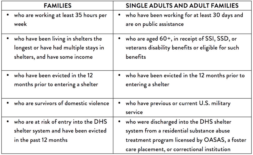 Mayor de Blasio’s reinstatement of rent supplement programs has made more homeless families and individuals eligible for assistance and helped more of them move out of shelters into permanent housing. In 2014, Mayor de Blasio launched a set of new longer-term rent subsidies for those in shelters or at risk of becoming homeless. Table1 outlines the current rent supplement eligibility criteria.