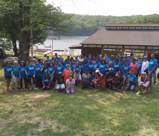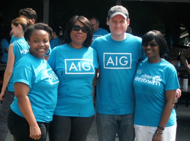 Posted on September 10, 2015 by Nicole Edine At the Coalition, we’re lucky to have many amazing sponsors that help us ameliorate the suffering of homeless men, women and children everyday. One of our biggest supporters, AIG, has been a Premiere Corporate Sponsor for three years in a row, providing 90,000 meals to homeless men, women and children through our Grand Central Food Program and ensuring that homeless girls and boys have an amazing summer at Camp Homeward Bound. Twice a month, AIG volunteers assist our GCFP staff in distributing food to hungry and homeless New Yorkers on the streets of the city. They hand out hearty stew, bread, fruit, milk and water – as well as warm coats, socks and other necessities when available. The volunteers’ commitment, compassion and enthusiasm are deeply appreciated by the all of the homeless men and women they help. AIG first got involved with the Coalition by participating in our annual Project Back to School and Holiday Toy Drives in 2011, collecting donations and sorting and packing backpacks with school supplies. In 2012 AIG employees started an annual tradition of volunteering at our “camp clean-up day” at Camp Homeward Bound in Harriman State Park. They sweep, paint and clean up the campsite so that 300 homeless boys and girls can enjoy a wonderful summer of swimming, biking, friends and fun away from the stifling shelter system. This year was no exception, as nearly 70 AIG volunteers drove up to Camp in early June to set up tents and make minor repairs around the campsite. The Coalition would like to thank AIG for its continued support of the GCFP, Camp Homeward Bound, Project Back to School and our Holiday Toy Drive. Corporations that support the Coalition for the Homeless know that doing good is good business. Learn more about Corporate Sponsorships and Volunteer Opportunities.
