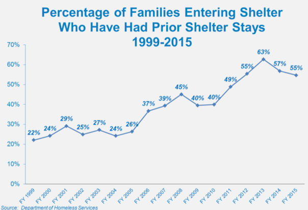 Lastly, another significant and long-term consequence of Mayor Bloomberg’s abandonment of permanent housing solutions in 2005 was a substantial increase in the percentage of “repeat families” entering shelter – that is, families who had previously been homeless and again found themselves in need of shelter. The high shelter return rate exemplified the instability caused by a lack of resources to keep families stably housed. Over the past two years, as the City has moved away from short-term time-limited subsidies and toward longer-term solutions, this trend has started to reverse – albeit slowly. In both fiscal years 2014 and 2015, the percentage of “repeat families” decreased from the previous year. In 2015, the rate is now down 8 percentage points to 55 percent, from a high of 63 percent in 2013.