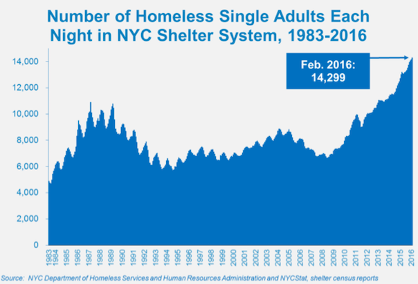 Over the past year and a half, the de Blasio administration has implemented a series of new programs and policy reforms to more effectively address the city’s homelessness crisis. However, the root causes of homelessness in New York City have persisted – and in some cases have worsened – highlighting the increased urgency in embracing the full set of proven solutions. Mass homelessness in New York City stems from two key factors: the city’s ongoing affordable housing crisis, and the legacy of the disastrous policy decisions made by Mayor Bloomberg.