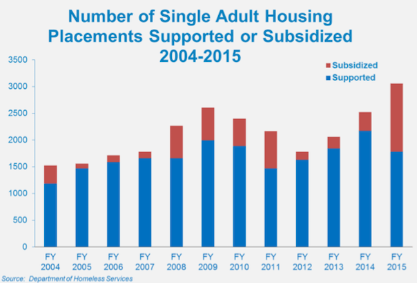 Although the majority of homeless single adults continue to leave shelter without any housing assistance, last year the number of adults receiving housing assistance increased significantly – stemming from a substantial increase in the number of single adults obtaining subsidized housing placements. In fiscal year 2015, over 3,000 single adults moved from shelters into supported or subsidized housing, including more than 1,200 subsidized placements—nearly four times the amount of subsidized placements for the previous year, and far above any year before that. Two-thirds of the way through fiscal year 2016, 1,200 single adults have already moved out with City-subsidized placements. However, the number of supportive housing placements decreased by 18 percent in 2015, illustrating the increased urgency to develop new supportive housing units this year to ease the ongoing homelessness crisis for single adults with severe mental illness and other disabilities.