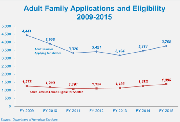 A final potential driver of increased street homelessness is the shelter application process for families without children, also known an as “adult families.” These families are often made up of a couple or a family with adult children. While adult families make up a relatively small portion of the shelter population, the application process for this population is the most challenging. Despite the fact that half of all families with children applying for shelter were found eligible in fiscal year 2015, only 37 percent of adult families were found eligible. Many adult families face barriers documenting their past housing histories if they have lived on the streets, and others face severe disabilities that make the application process difficult and onerous. Indeed, many adult families that unsuccessfully try to enter shelter may end up on the streets.