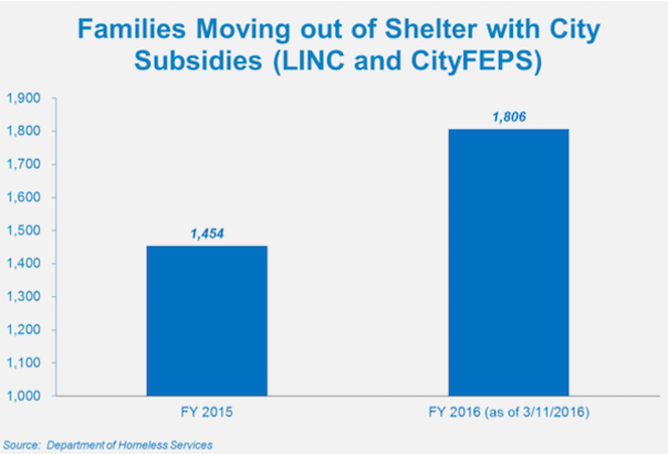 In addition to reinstating priority for federal resources, the de Blasio administration also created a series of flexible, long-term rental subsidies to move homeless families up and out of shelter. These include the array of LINC subsidies and CityFEPS – which are funded in large part without State contribution. In fiscal year 2015, more than 1,400 families moved out of shelter via these City-funded subsidies. And now, as we stand two-thirds of the way through fiscal year 2016, the de Blasio administration has moved over 1,800 families into permanent housing with these subsidies.