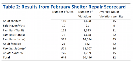There has been increased attention over the past year on conditions and safety in homeless shelters, including reports from the Office of the Comptroller and the Department of Investigation detailing myriad conditions problems in family shelters, as well as recent press reports about the alarming number of violent incidents in homeless shelters. The Mayor’s office recently released several “report cards” detailing such problems across the system – including violations from multiple city agencies such as HPD, DOB, and FDNY. These reports confirm that the majority of problems continue to stem from the use of cluster site apartments to shelter homeless families. Violations in cluster sites make up 69 percent of all violations across the system, and have the highest average rate of violations: 45 per site. Across the system, violations in family shelters make up over 90 percent of all recorded conditions violations.