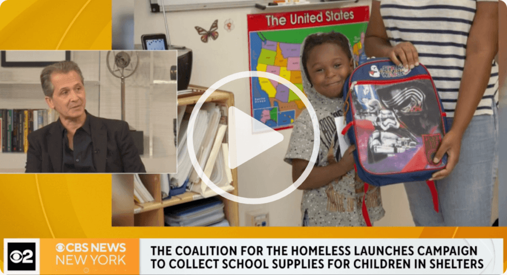 Posted on September 20, 2024 by Gresham Worth This summer, thanks to the incredibly generous support from donors across our city and state, the Coalition for the Homeless’ annual Project: Back to School drive was an outstanding success. Because so many New Yorkers stepped up to show how much they care about the thousands of children living in shelters, the Coalition was able to fill more than 5,500 new backpacks with the supplies students need to succeed in the new school year. And our 2024 Project: Back to School drive was even more exciting this year as the Coalition was invited to CBS News Studios to speak about the program. Coalition for the Homeless Executive Director said it best while sharing the couch with CBS News Anchor Natalie Duddridge on CBS News at 9. “We started the program about 15 years ago when we saw that the parents of kids in shelters were saving every penny that they had to try and move out in permanent housing. And something as simple as a backpack filled with school supplies was just unaffordable. Now these kids are already having a really hard time. It is very traumatic for a child to fall into homelessness; to be uprooted from their neighborhood and everything familiar to them, to move to a shelter that might be a long commute from their school. Living in a shelter there is often no quiet place to study. And it’s sad but kids are often teased in school for being homeless, for living in a shelter. So we thought one thing we could do is at least allow them on that first day of school to show up with a backpack full of school supplies so they are able to not stand out and go in with some confidence”. With more children living in New York City Shelters than ever before, supporting these great kids with a backpack full of supplies – something a housed student may take for granted – is only a small gesture, but helps level the playing field and gives them a chance to kick off their academic year strong. Thank you again to all who supported PBTS for your compassion and commitment to helping homeless children access the educational opportunities every child in our city deserves. Don’t forget! Though Project: Back to School has concluded, there are still ways to support homeless students this year. Bound for Success is the Coalition’s after-school program providing one-on-one tutoring, recreational activities, and emotional support to school children in shelters. We hope you’ll consider making a back-to-school gift to help these kids achieve a brighter future!